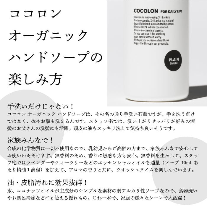 100%オーガニック素材 JONAコスメ認証取得 石けん素地と食用ココナッツオイルだけでつくった100%ピュアなハンドソープ 使い心地がやさしいのに、しっかりとした洗い上がり!
