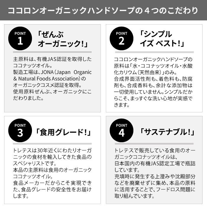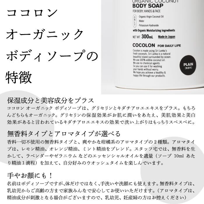 100%オーガニック素材 JONAコスメ認証取得 石けん素地と食用ココナッツオイルだけでつくった 100%ピュア ボディーソープ 使い心地がやさしいのに、しっかりとした洗い上がり!