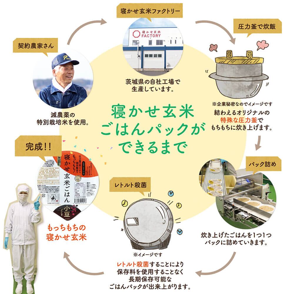 国産特別栽培玄米100%と北海道十勝産の小豆と瀬戸内産海水塩を、特殊な圧力釜で炊き、自社製法により、玄米のイメージを覆す、もっちもちの寝かせ玄米です。やさしい甘みでほっくりとした味わいです。